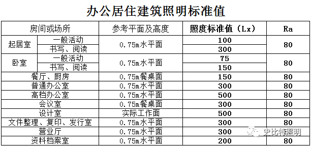 而在日常的工作、生活中,不同的场所也都有自己的照明标准值: