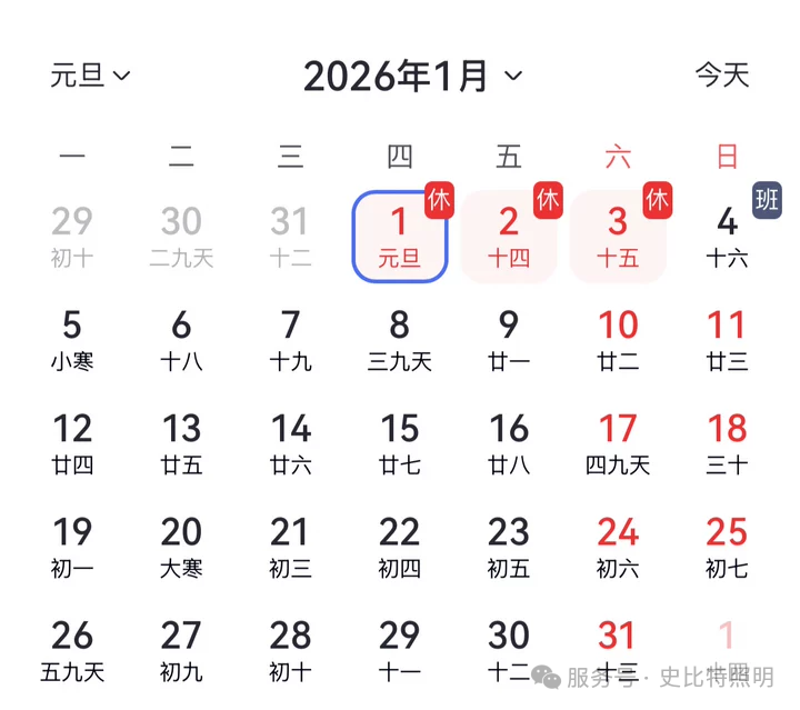 1月4日(周日)正常上班